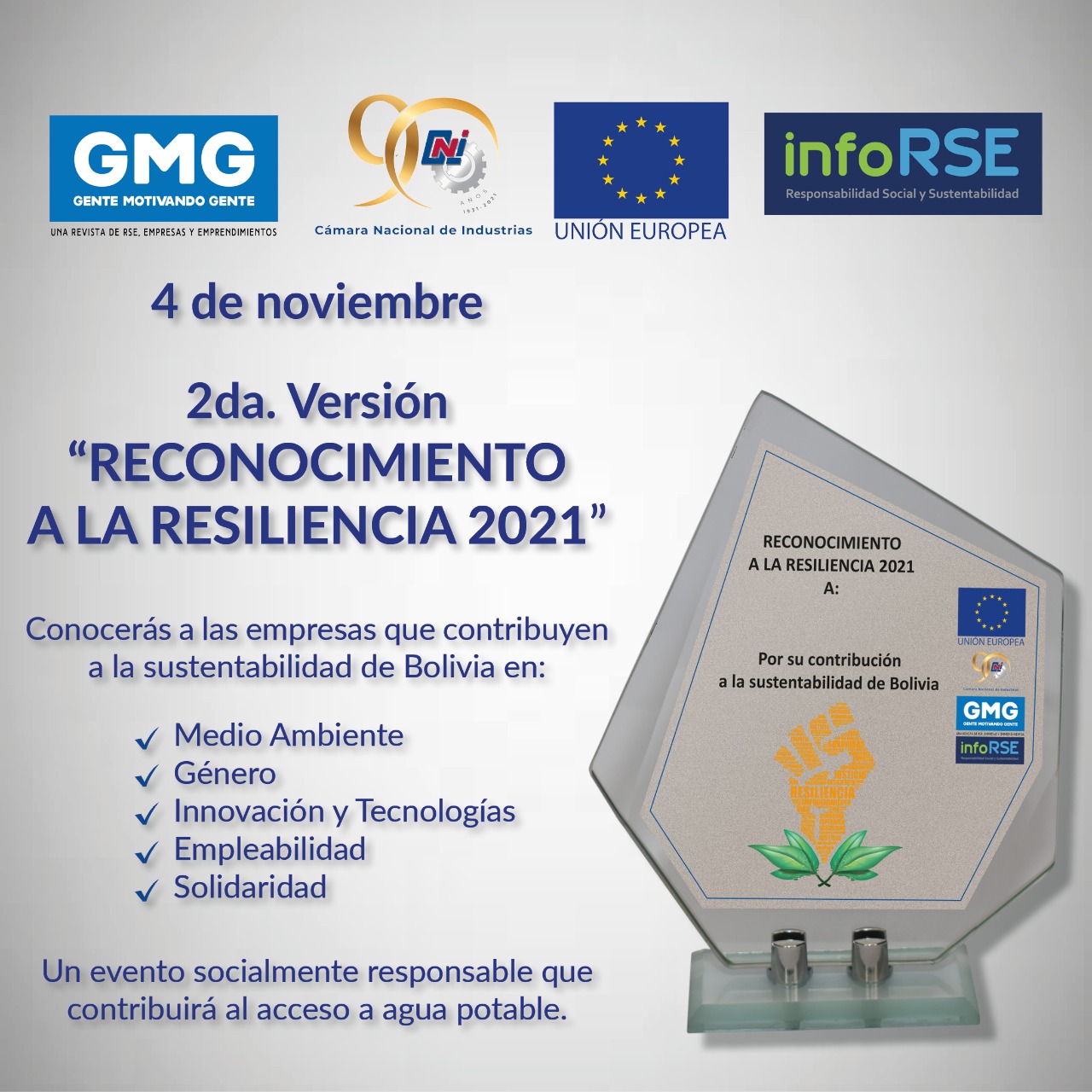 Te presentamos las 5 categorías de la 2da. Versión del “𝐑𝐄𝐂𝐎𝐍𝐎𝐂𝐈𝐌𝐈𝐄𝐍𝐓𝐎 𝐀 𝐋𝐀 𝐑𝐄𝐒𝐈𝐋𝐈𝐄𝐍𝐂𝐈𝐀 𝟐𝟎𝟐𝟏”, un galardón que entrega la Cámara Nacional de Industrias, la Unión Europea, InfoRSE y Gente Motivando Gente. ¡No te pierdas el evento el 4 de noviembre!