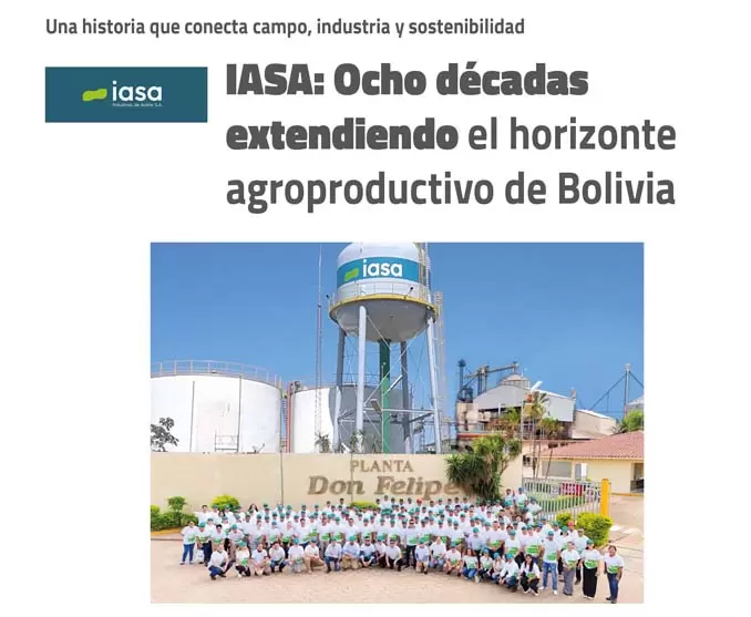 Hoy, con 80 años de historia, IASA se reafirma como una compañía que produce con eficiencia, genera empleo, exporta valor agregado y protege el medioambiente. Es un actor estratégico para Bolivia y para su futuro alimentario, porque trabaja extendiendo el horizonte agroproductivo de forma innovadora, ética y sostenible.